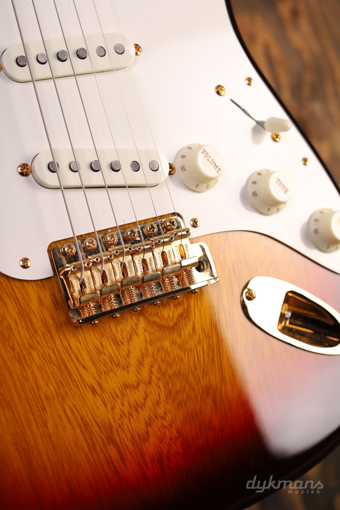 De mensuur van 25.5 inch over 21 frets geeft je die karakteristieke Strat-spanning en helderheid, terwijl de Custom Shop vintage-style bridge in goud niet alleen prachtig oogt, maar ook perfect intoneert. De Fender tuners houden alles stabiel gestemd, zelfs na intensief tremolo-gebruik.
