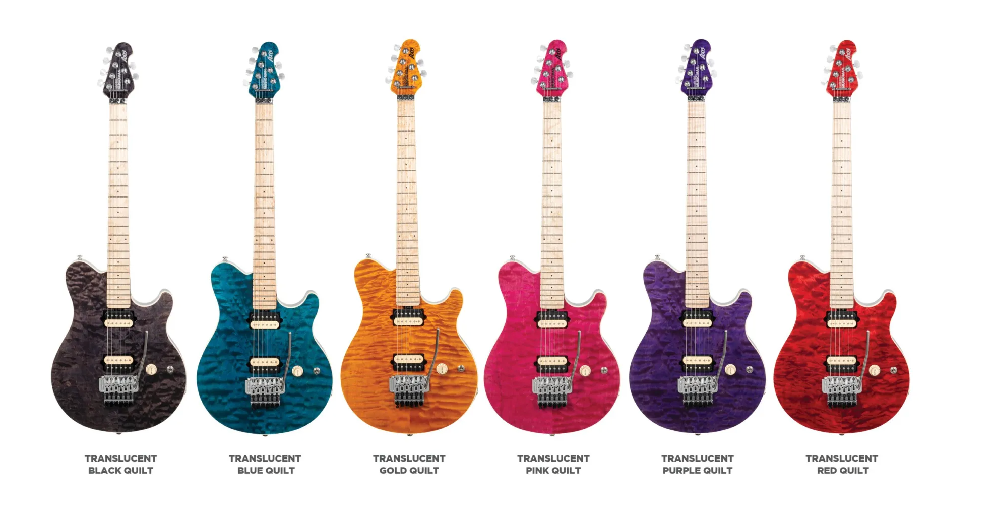 Introducing the 30th Anniversary Axis guitar. To mark 30 years of the Axis, we're revisiting the translucent finishes that defined its 1996 debut—Translucent Gold, Black, Pink, Red, Blue, and Purple—applied to hand-stained quilt maple tops and paired with black, lightly sparkled backs that subtly echo each color. Each guitar features a figured maple neck with stainless steel frets, glow-in-the-dark side dots, the original asymmetrical neck carve, and the sought-after DiMarzio® custom-wound pickups that helped define the Axis feel and sound. Finished with a color-matched headstock face, a 30th Anniversary Axis logo on the back, and limited to 90 Gold, 60 Black, Pink, and Purple, and 30 Blue and Red instruments worldwide, every guitar ships with a certificate of authenticity and a deluxe Music Man® hardshell case. The 30th Anniversary Axis Guitar will be available this jump .