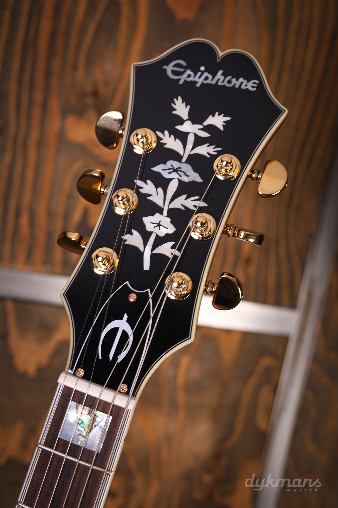 The neck is a solid piece of mahogany with a comfortable 60s C-profile , topped with a rosewood fingerboard, 22 medium-jumbo frets, and stylish abalone triangle block inlays . The signature large Sloped Dovewing headstock from the '60s bears the historic Epiphone logo and a beautiful mother-of-pearl "Tree of Life" inlay.